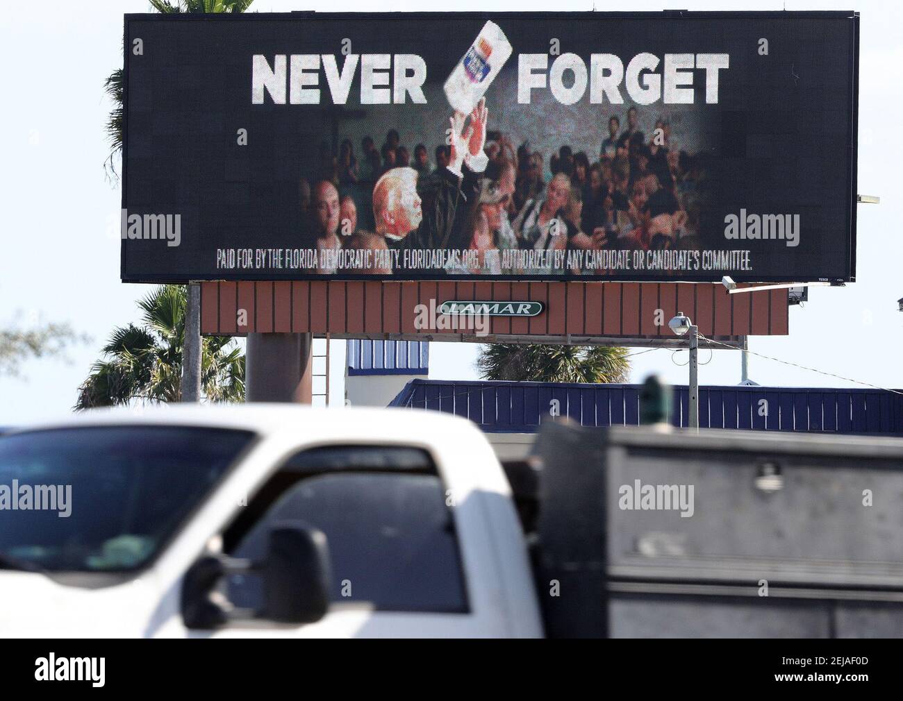 Traffic Passes A Billboard Located On The Florida Turnpike At U S 441 In Orlando Fla Monday Jan 13 2019 Featuring President Donald Trump In An Infamous Photo Tossing Rolls Of Paper Towels
